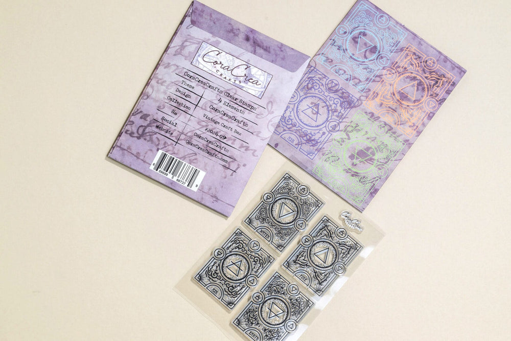 A beautiful clear stamp sheet exclusive of CoraCreaCrafts. It comes beautifully packaged in a themed envelope which can be reused in your crafts. This set features symbolism for each of the 4 elements of nature: fire, earth, air and water.