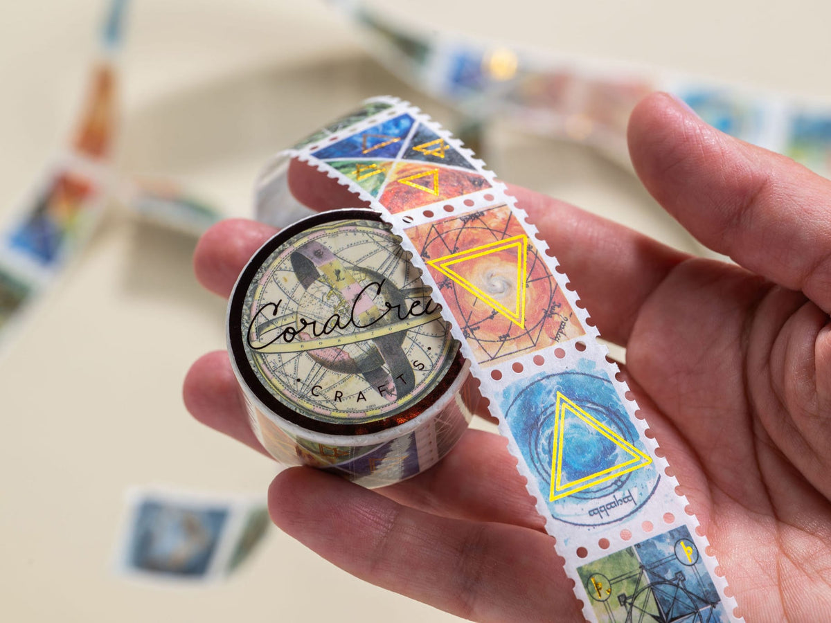 A unique vintage style washi tape designed by the artist Storm Sparrow exclusively for CoraCreaCrafts. It feature elemental symbols in a postal stamp format with beautiful gold foil details.