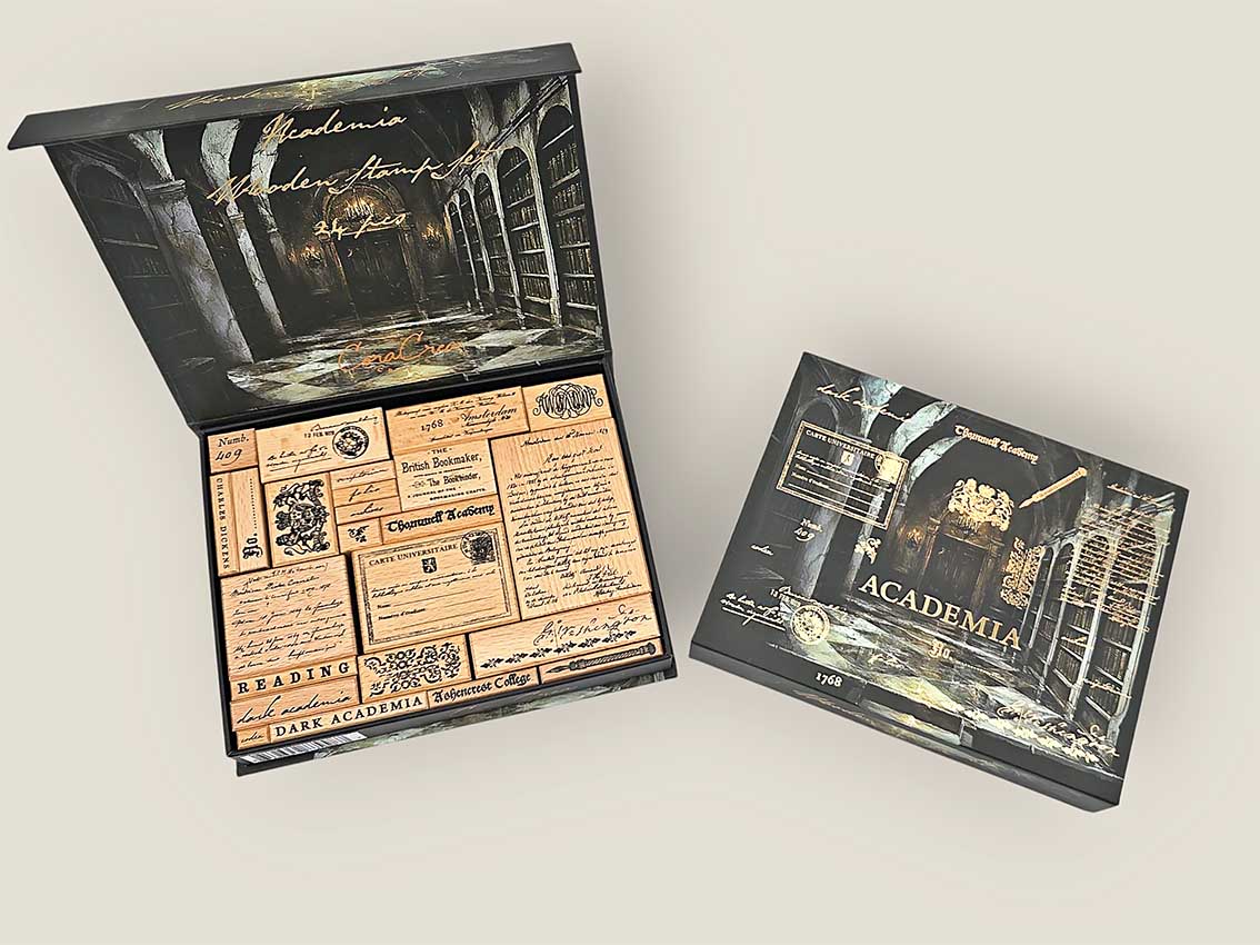 Unlock a world of vintage charm with the Intricate Academia Wooden Stamp Set, 24 beautifully crafted pieces inspired by classic academic motifs with a dark academia twist.