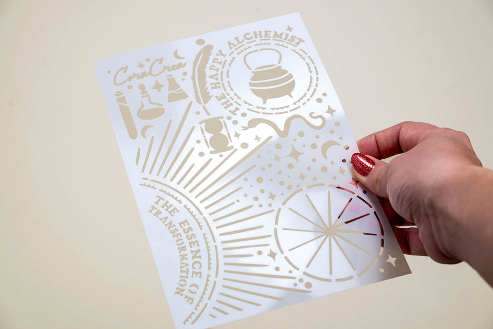 The Alchemy Stencil includes a patterns and alchemy inspired details and is ideal for adding texture to any crafting project.
