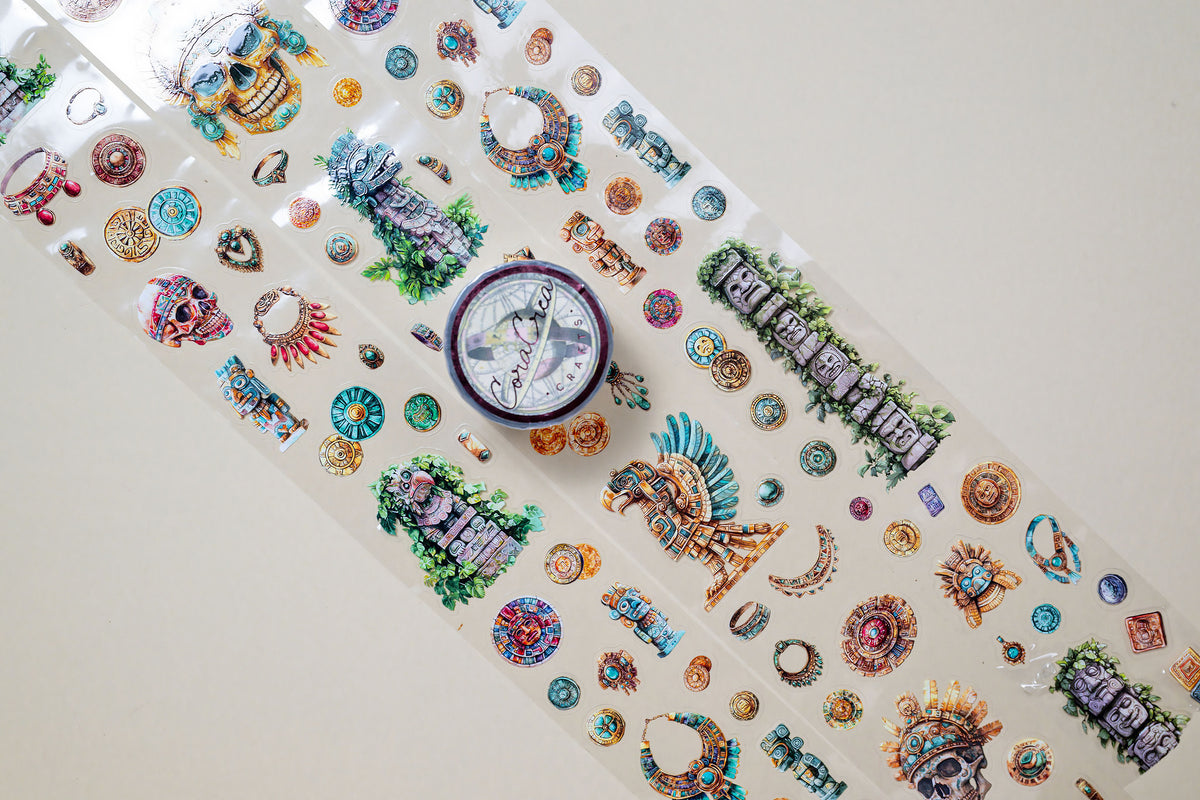 Effortlessly add a unique touch to your projects with this pre-cut transparent (PET) tape. Just peel off individual designs like stickers. With designs inspired by the Aztec and specifically centered around temples, rituals and relics, this tape is a must-have for all history lovers.