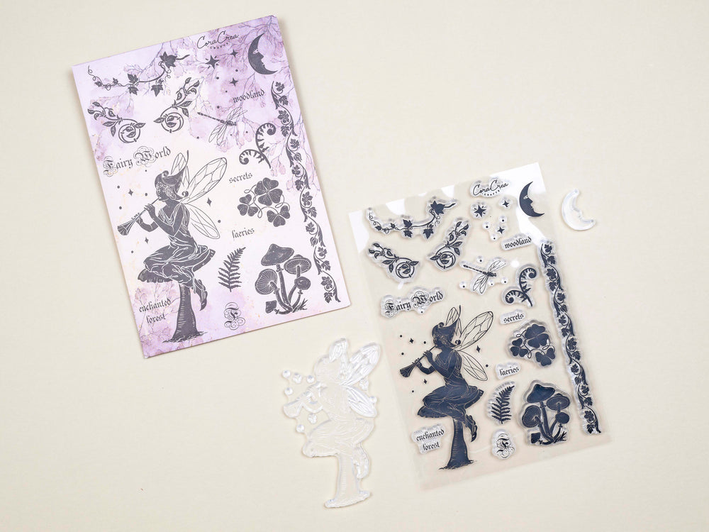 Bring tiny moments of magic to your crafts. This high-quality clear stamp set includes 19 finely detailed designs, whimsical phrases, delicate fairies, woodland motifs, and small nature accents, perfect for journaling, scrapbooking, card making, tags, and happy mail.