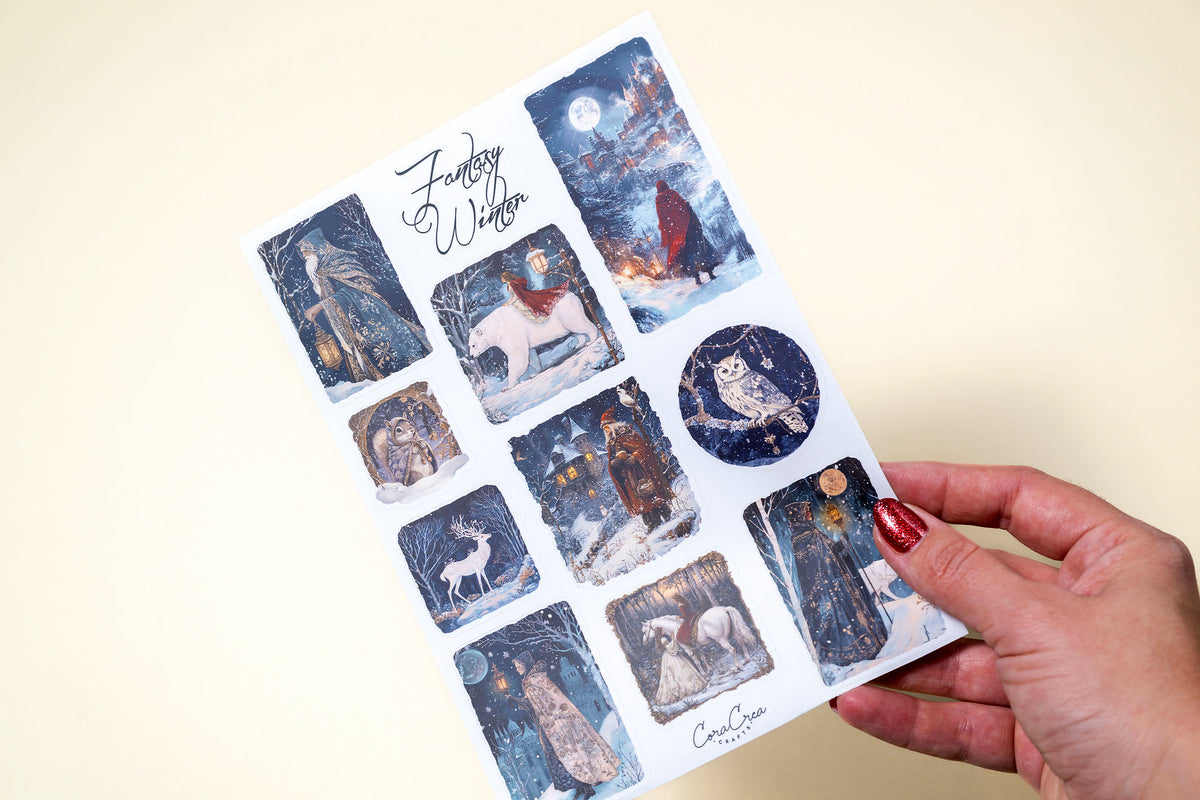 Bring the enchanting beauty of winter to your creative projects with the Fantasy Winter Sticker Sheet, an exclusive design by CoraCreaCrafts. These high-quality stickers are printed on durable vinyl matte paper, featuring magical winter-themed illustrations that capture the frosty elegance and mystical charm of the season.