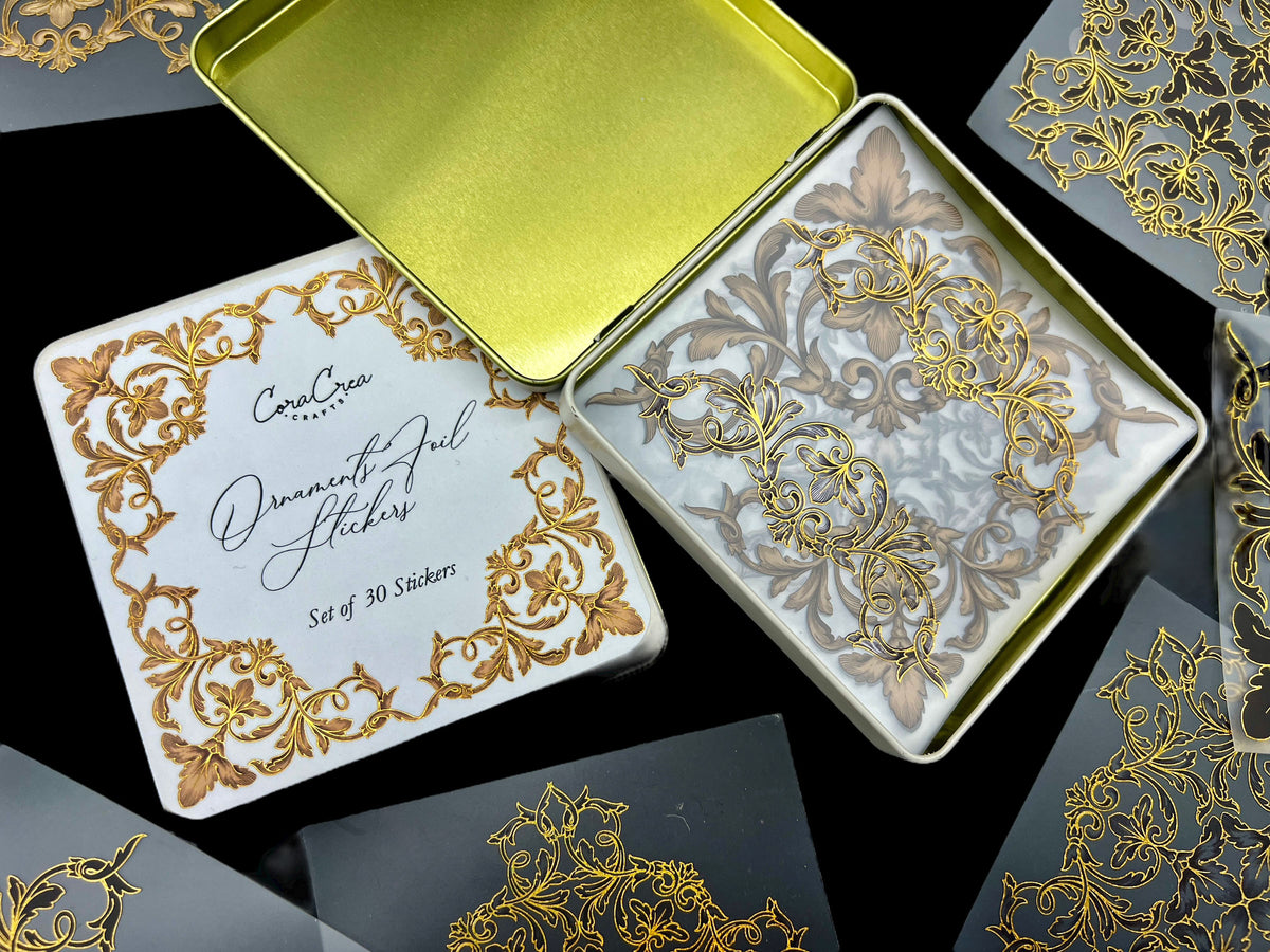 Ornaments Foil Sticker Box Is an exclusive product created by CoraCreaCrafts. Use to embellish your journal pages with gorgeous gold foiled ornament designs.
