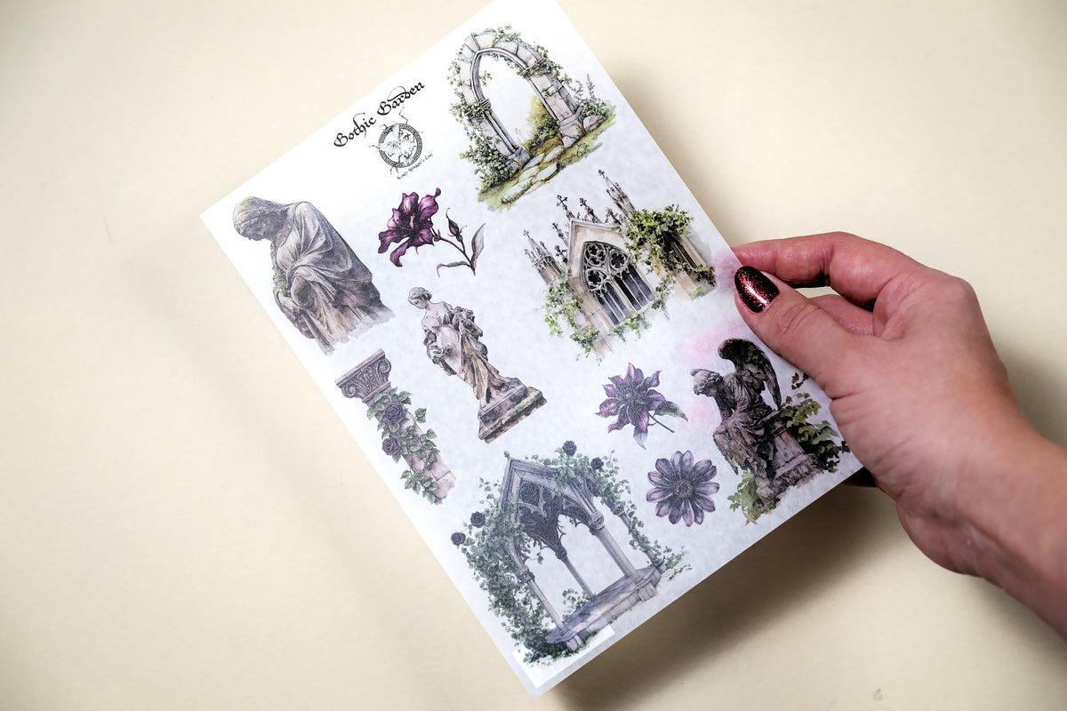 Immerse yourself in the dark elegance of the Gothic Garden with this exclusive sticker sheet. Featuring intricate botanical motifs and shadowy gothic details, these high-quality stickers are perfect for adding a touch of mystery and sophistication to your journals, scrapbooks, or creative projects.