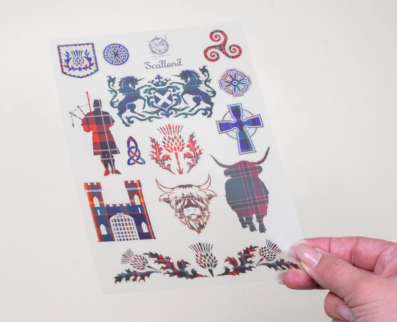 This sticker sheet features 14 traditional Scottish tartan designs printed on a transparent matte background—perfect for layering in your journal or adding a subtle vintage touch.