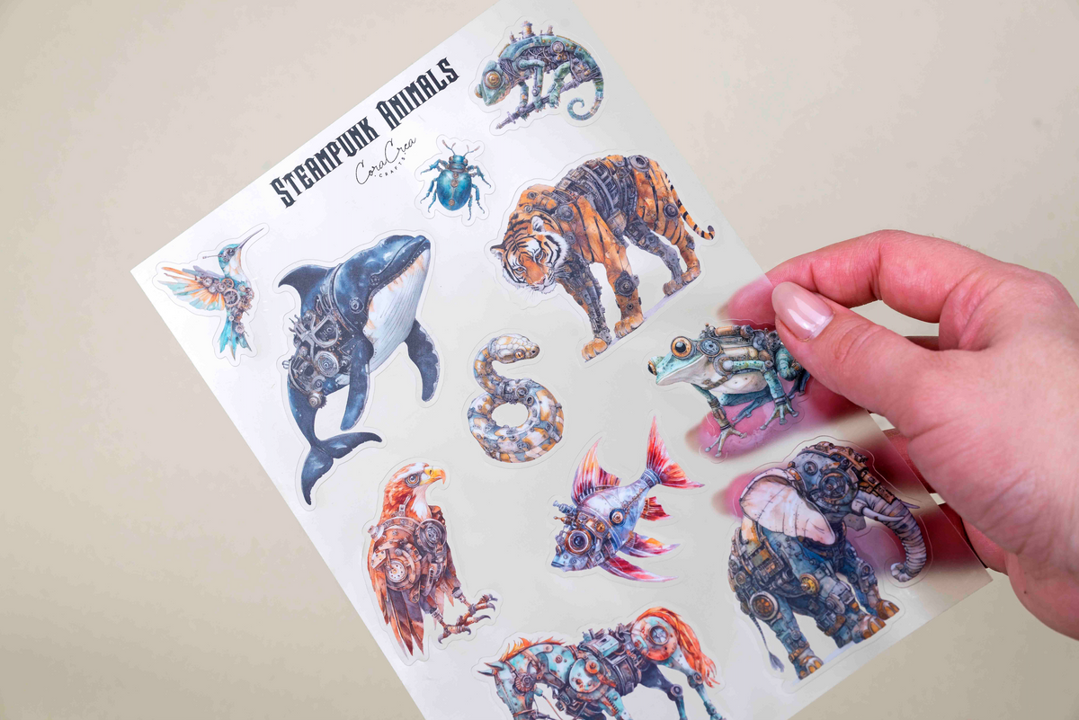 These Steampunk Animals Sticker Sheets showcase an imaginative mix of whimsical animals and industrial steampunk elements, making them perfect for adding a unique, creative touch to your projects. Printed on high-quality washi sticker paper, each design is easy to peel, reposition, and stick, making them ideal for journaling, scrapbooking, and cardmaking. Infuse your creations with a playful steampunk vibe using these versatile, eye-catching stickers.
