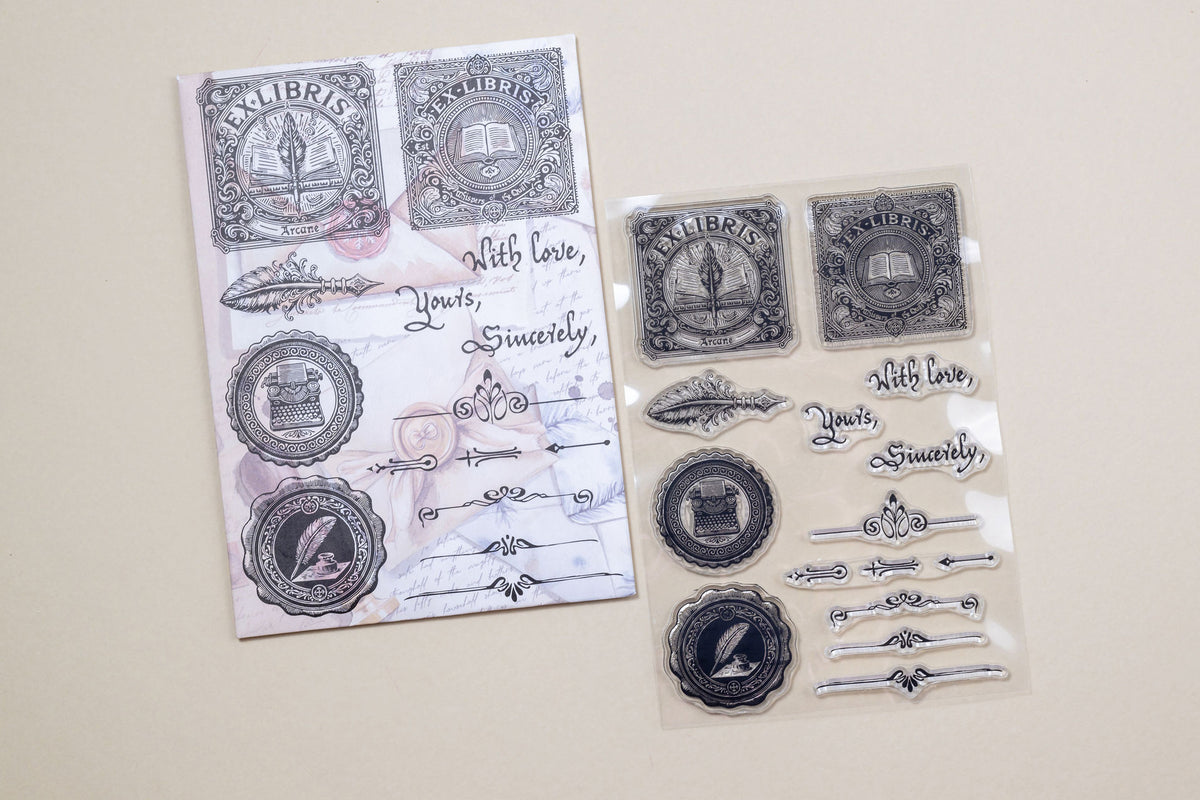 A beautiful clear stamp sheet by CoraCreaCrafts. It features various writing inspired designs such as quill pens, typewriters, letter text etc. This stamp sheet is 11 x 16cm and includes a total of 13 stamps. It comes beautifully packaged in a themed envelope which can be reused in your crafts.