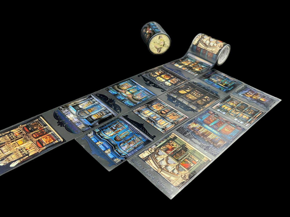 Step into a moody, magical street scene with this unique Victorian Storefronts transparent PET tape by CoraCreaCrafts. Featuring a collection of dark yet vibrant storefront illustrations, each design is rich with vintage detail and charm. The tape is finished with a shiny overlay, including a striking black gloss layer that brings depth and contrast to every image.