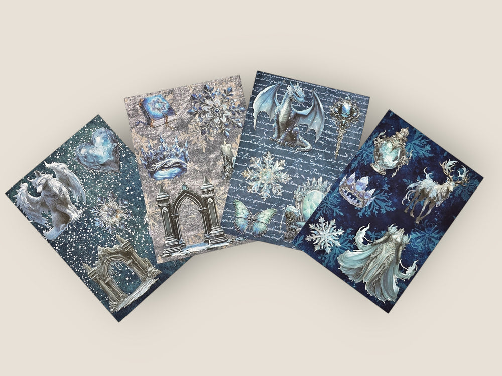 Dive into the world of fantasy with this brand new type of product in our shop: the Winter Fantasy Cutouts. These paper cutouts are printed double-sided on heavy-weight shimmer paper, cut expertly with laser to ensure a high level of detail, then foiled to add beautiful effects.